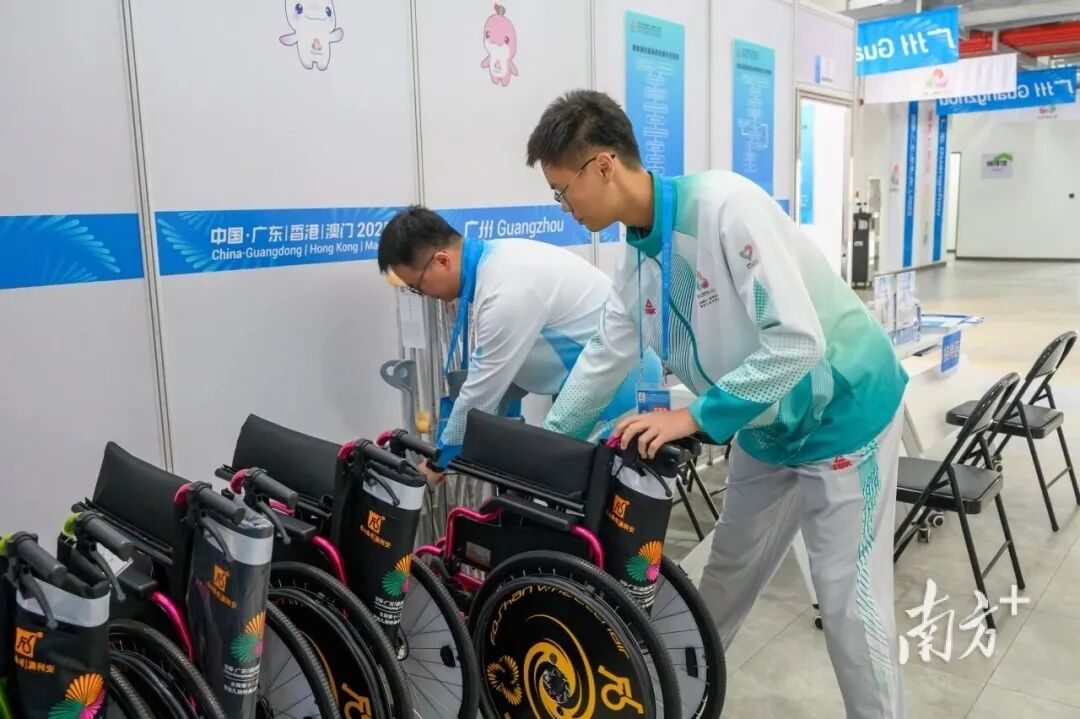广东第二师范学院志愿者余奕和小伙伴们在广州体育馆服务轮椅篮球项目。“大家私下里念叨累,但从没说过要放弃。”接车组的志愿者们每天在两百多米长的“奋斗坡”超12小时转运赛前赛后的生活轮椅与赛事轮椅,帮助运动员平稳上下坡,将“障碍”转化为“通途”。
