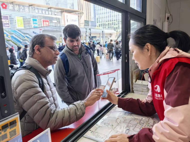 在深圳北站志愿服务U站前,两位外国旅客稍显迟疑地驻足询问,其中一人还拿着手机对照信息。身穿红马甲的志愿者见状主动迎前,一边用手机展示班次动态,一边用英语讲解进站路线和注意事项。随着问题逐一被解答,两人神情逐渐放松。离开时,他们微笑着连声道谢,车站往来人流中,这一段耐心细致的帮助,成了旅途中最暖心的插曲。