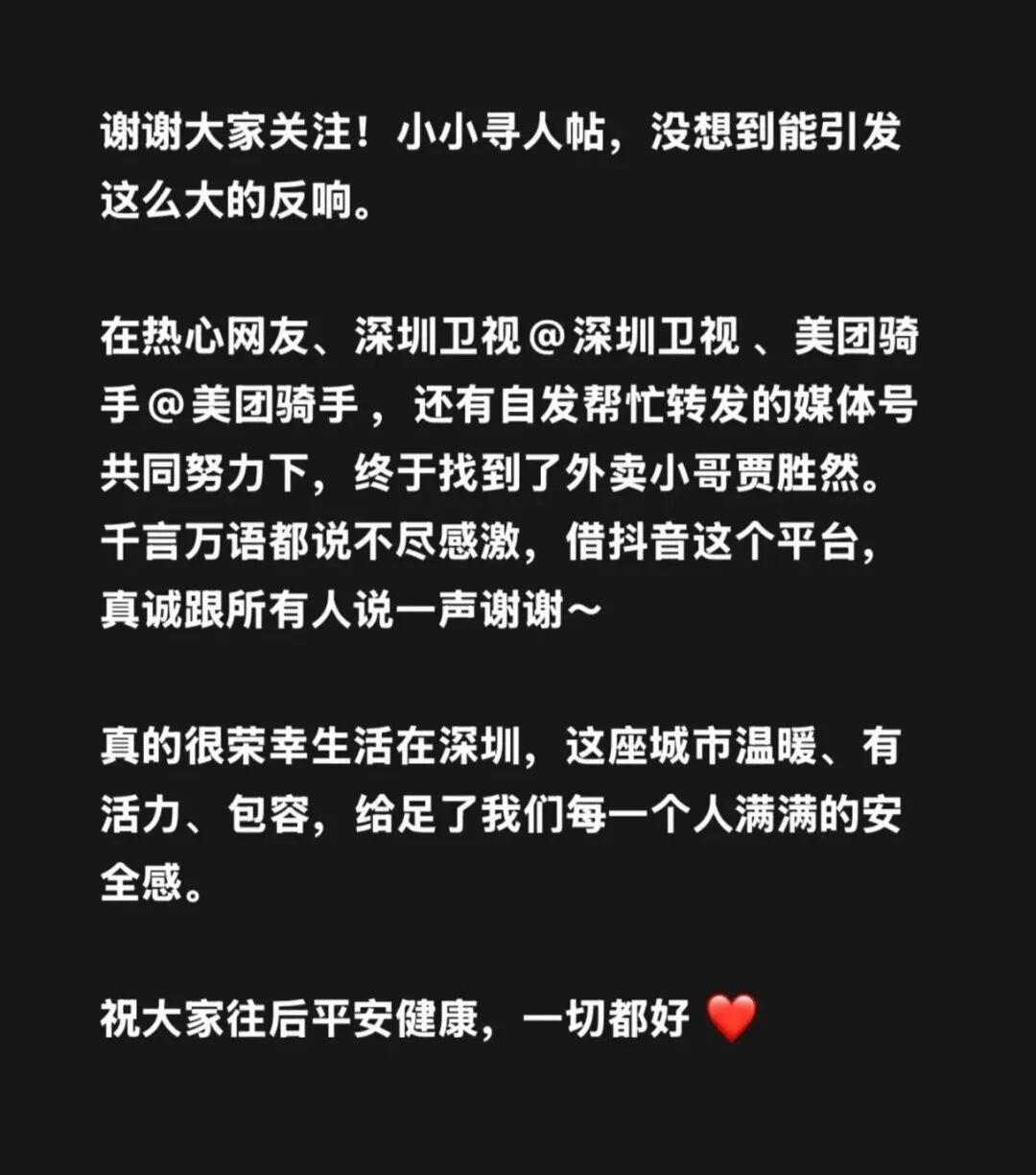 今天上午,李女士顺利见到了贾胜然。她说:“现在回忆起来,脑子里都还是一片空白,千言万语只有谢谢。除了谢谢我们也不知道还要说什么,同时也感谢广大网友、深圳卫视,是大家的关注,让我顺利找到了胜哥。”李女士还在社交平台更新了全城寻人的暖心结局。