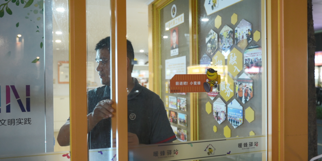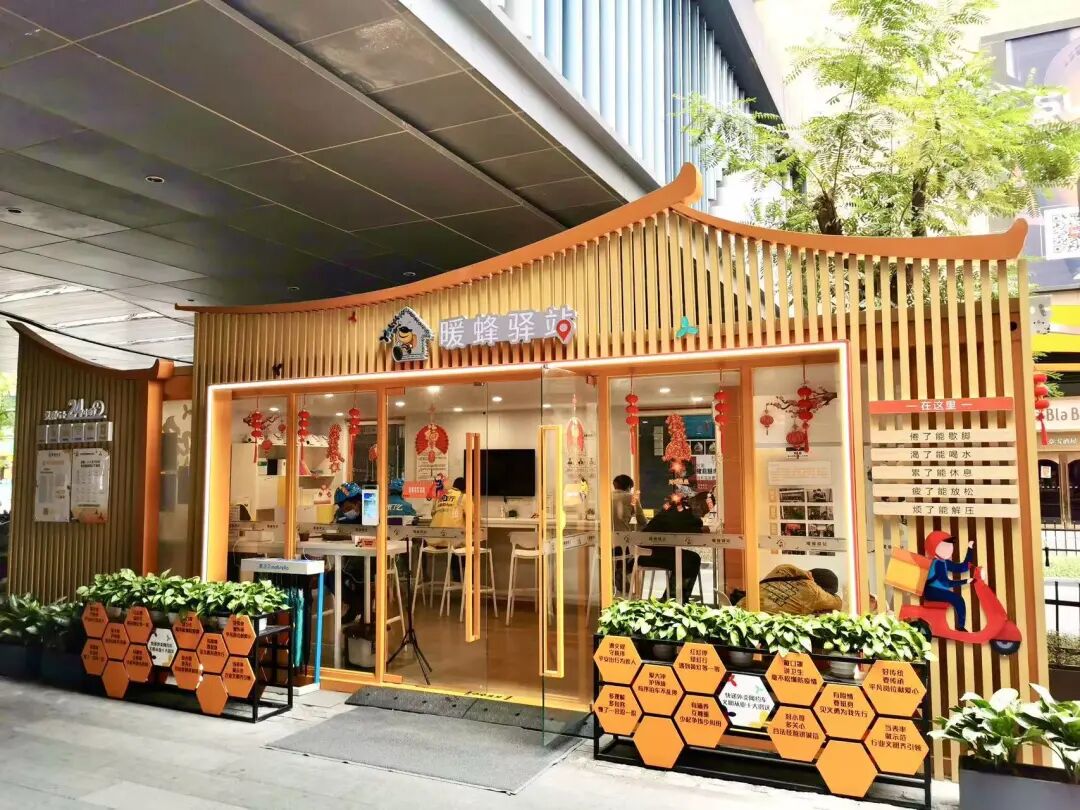他注意到这条美食街路边,突然多出一个黄色的小屋,上面写着四个字:“暖蜂驿站”。