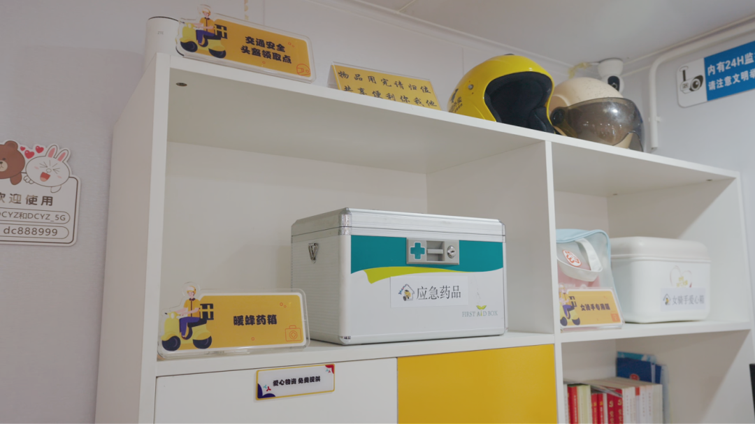 柜子上,除了备用头盔,还放着药品箱和女骑手爱心箱,里面不仅有棉签、创可贴,还有暖宝宝贴、卫生巾、热敷眼罩等。