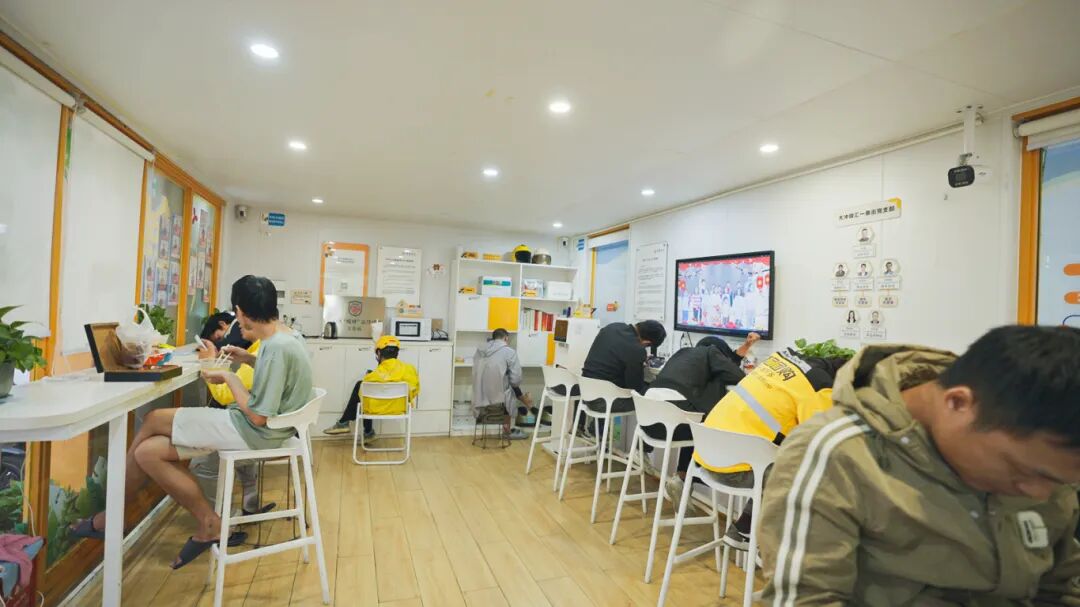 过去,骑手们没有固定的休息场所。而现在,这个小小的“黄屋子”,成为了他们遮风避雨的“落脚地”。
