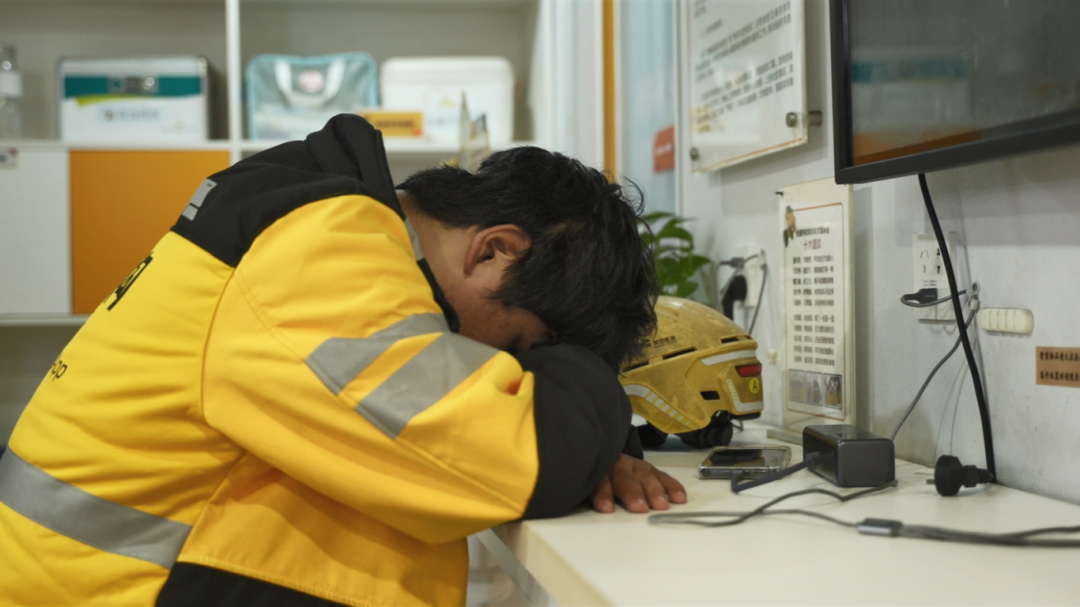 有人从电动车上取下杯子,接满一大瓶水;有人提着刚取的外卖,坐下吃两口热饭;有人把手机接上充电线,趁着等单的间隙再补几格电量;也有人趴在桌子上,闭眼眯上几分钟……
