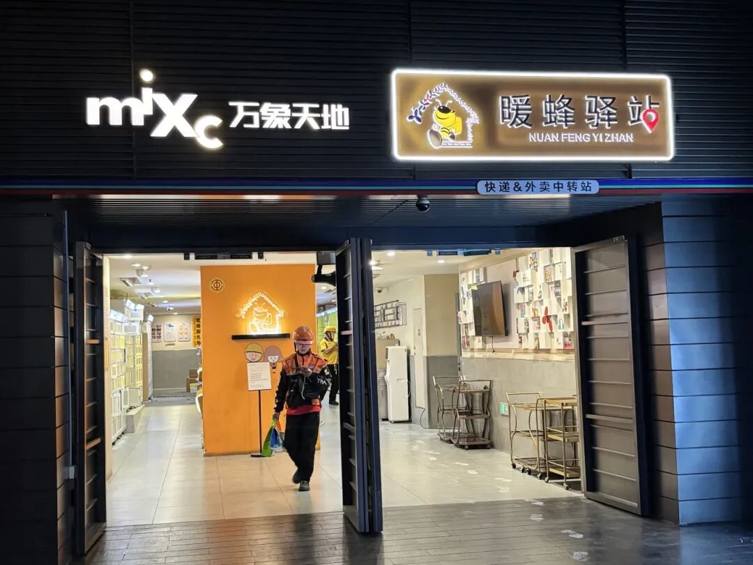 员工通道被改造为商圈型“暖蜂驿站”,配备外卖架和休息区,商户将外卖统一送到驿站,骑手也不用在商场里反复穿梭。