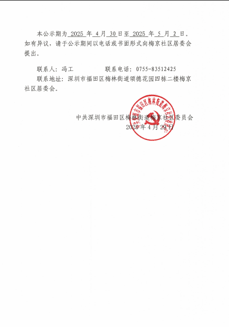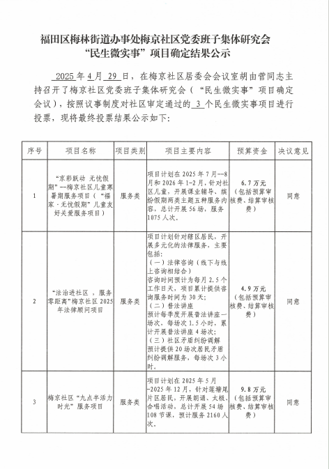 项目公示|福田区梅林街道梅京社区2025年党委班子集体研究会“民生微实事”项目确定结果公示(20250429)