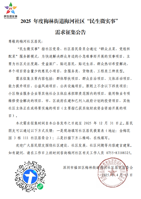 项目公示|福田区梅林街道梅河社区2025年“民生微实事”项目需求征集公告