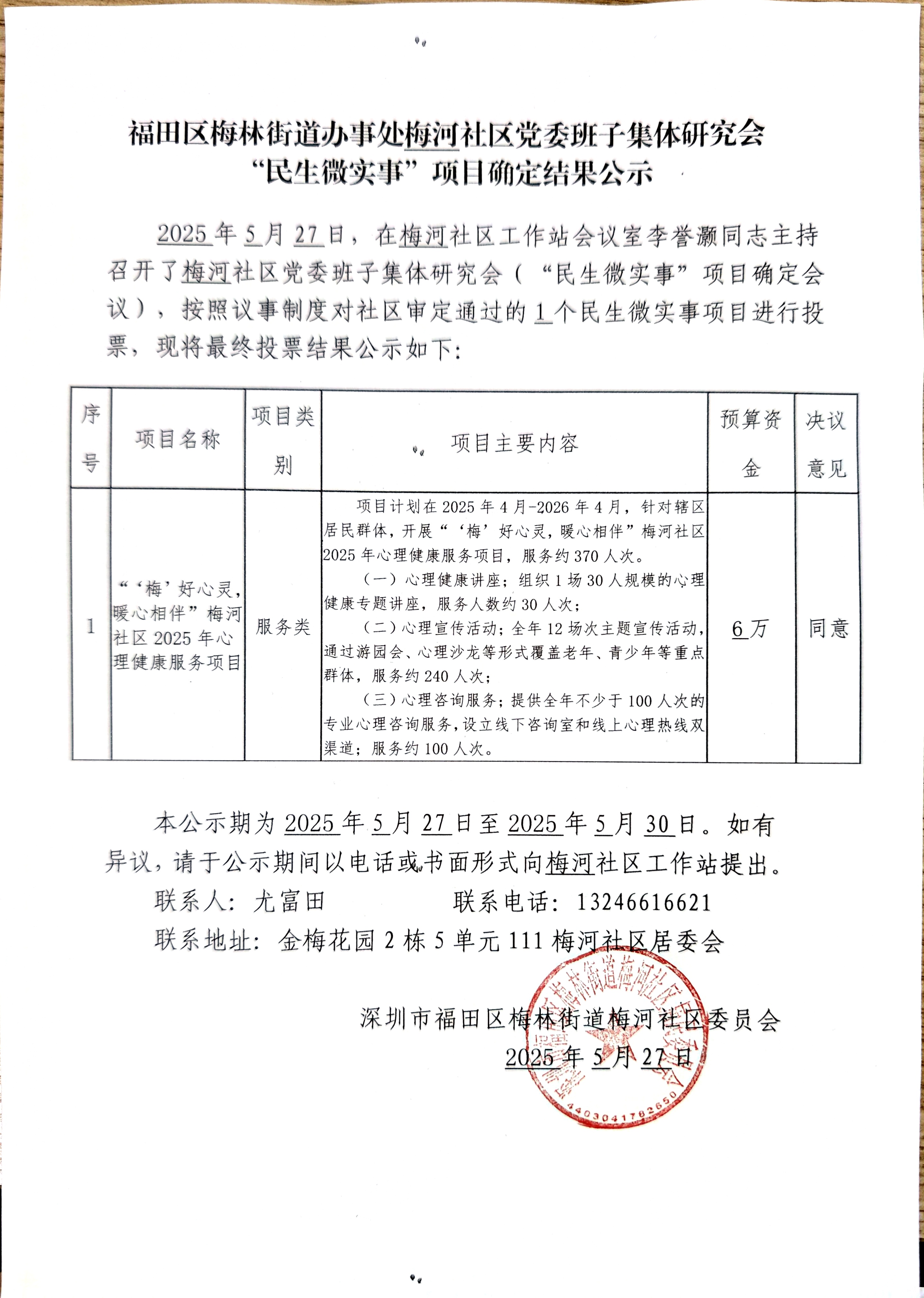 项目公示|福田区梅林街道梅河社区党委班子集体研究会“民生微实事”项目确定结果公示