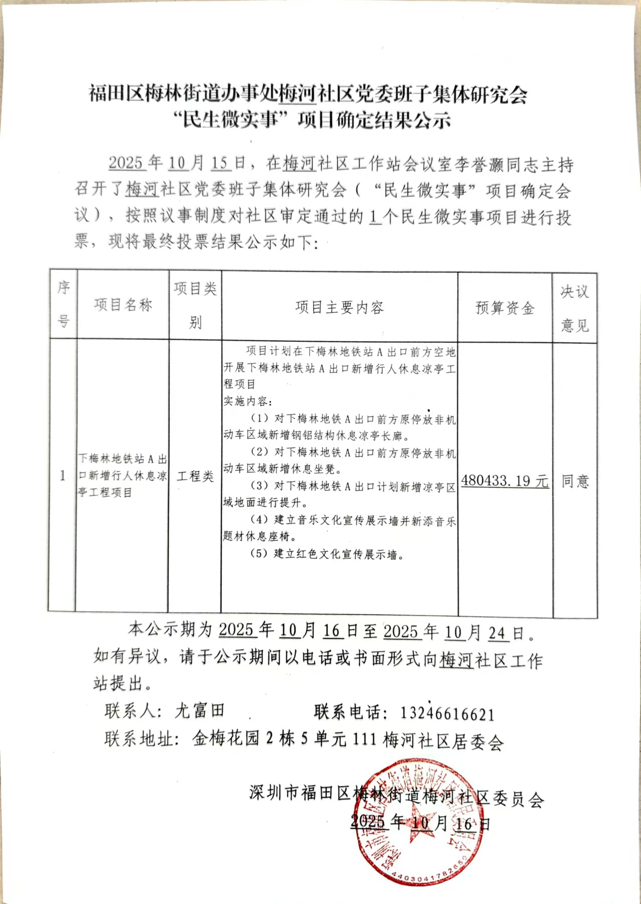项目公示|福田区梅林街道梅河社区党委班子集体研究会“民生微实事”项目确定结果公示