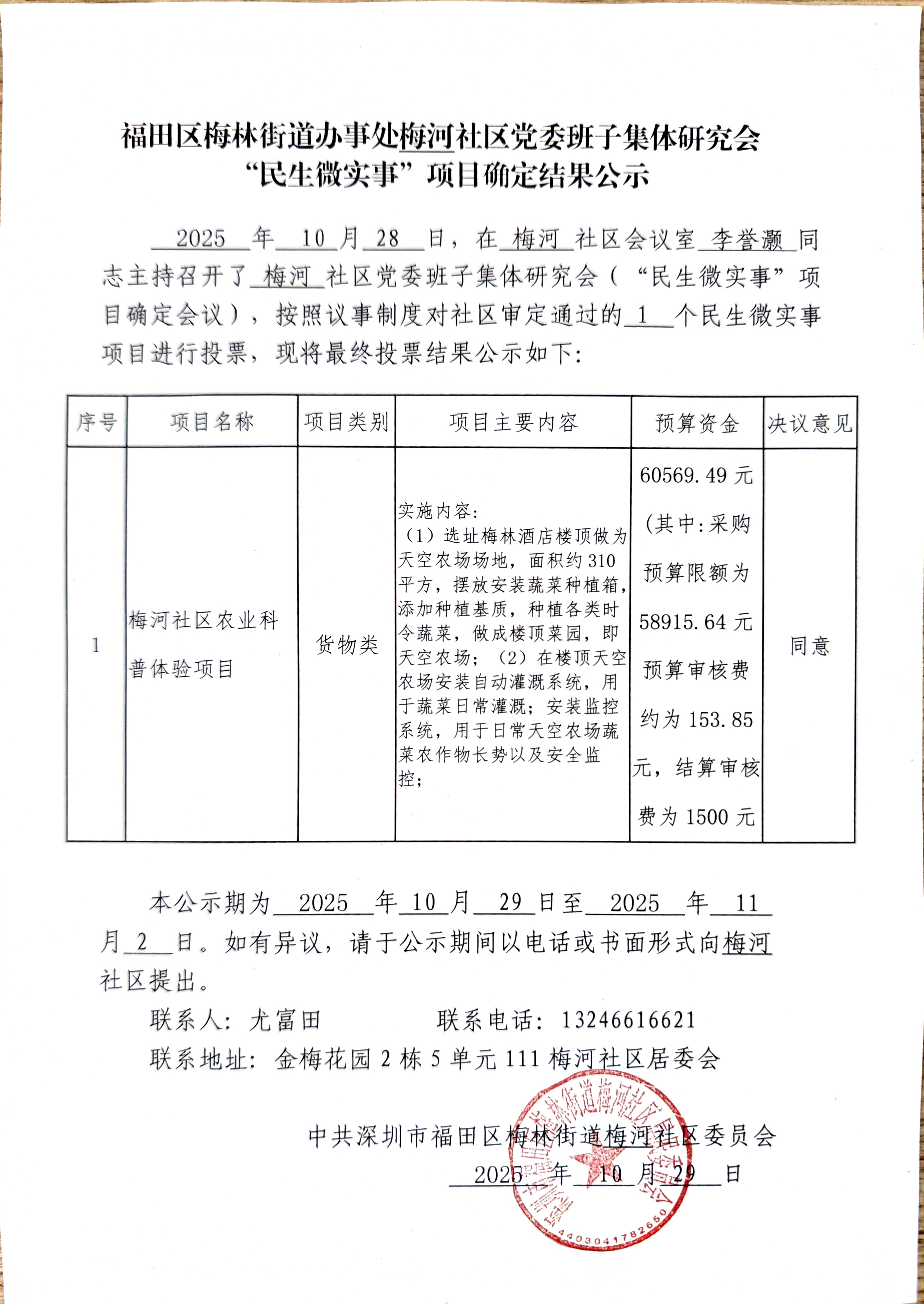 项目公示|福田区梅林街道梅河社区2025年梅河社区农业科普体验项目“民生微实事”项目确定结果公示