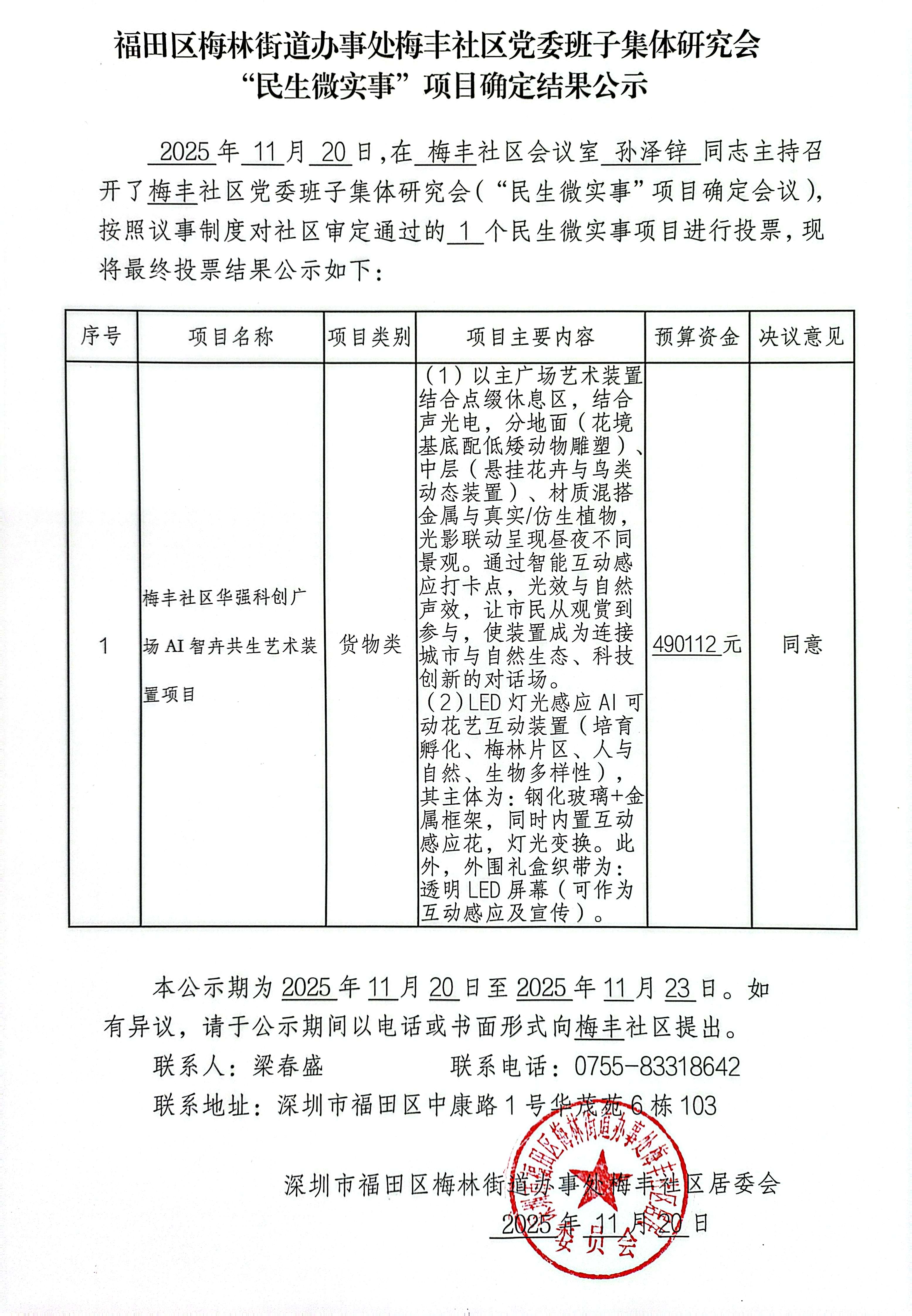 项目公示|福田区梅林街道梅丰社区党委班子集体研究会“民生微实事”项目确定结果公示