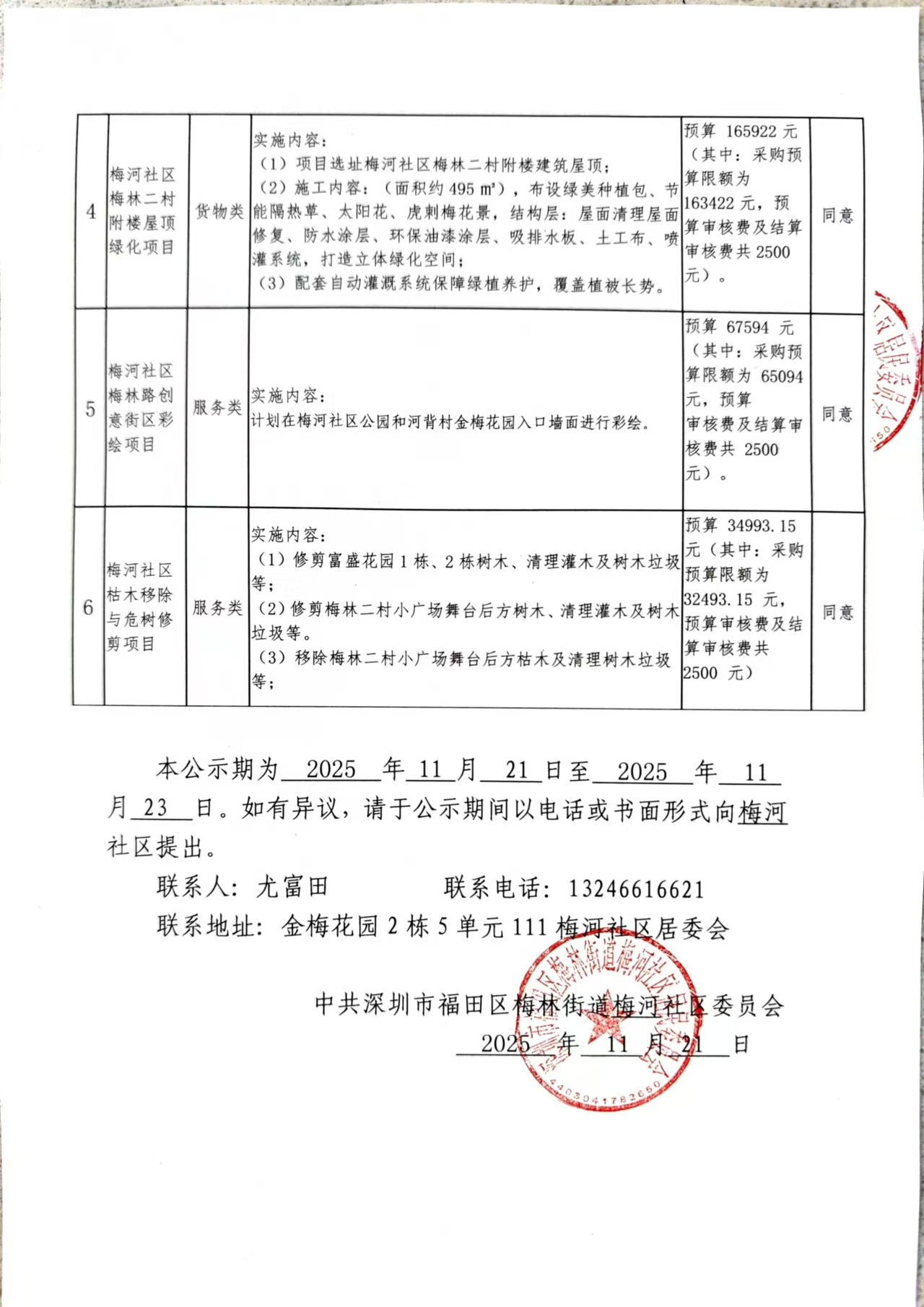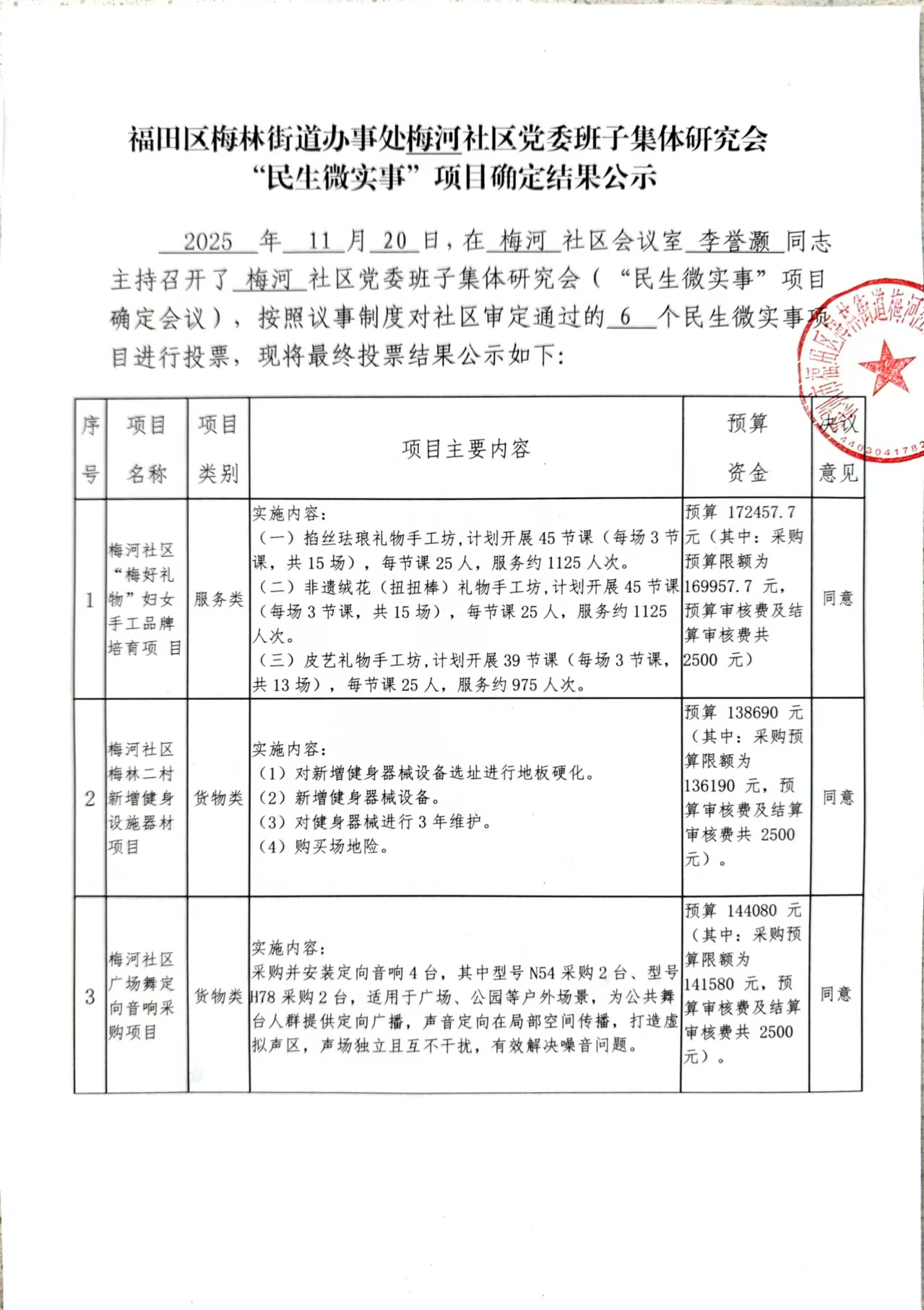 项目公示|福田区梅林街道梅河社区党委班子集体研究会“民生微实事”项目确定结果公示