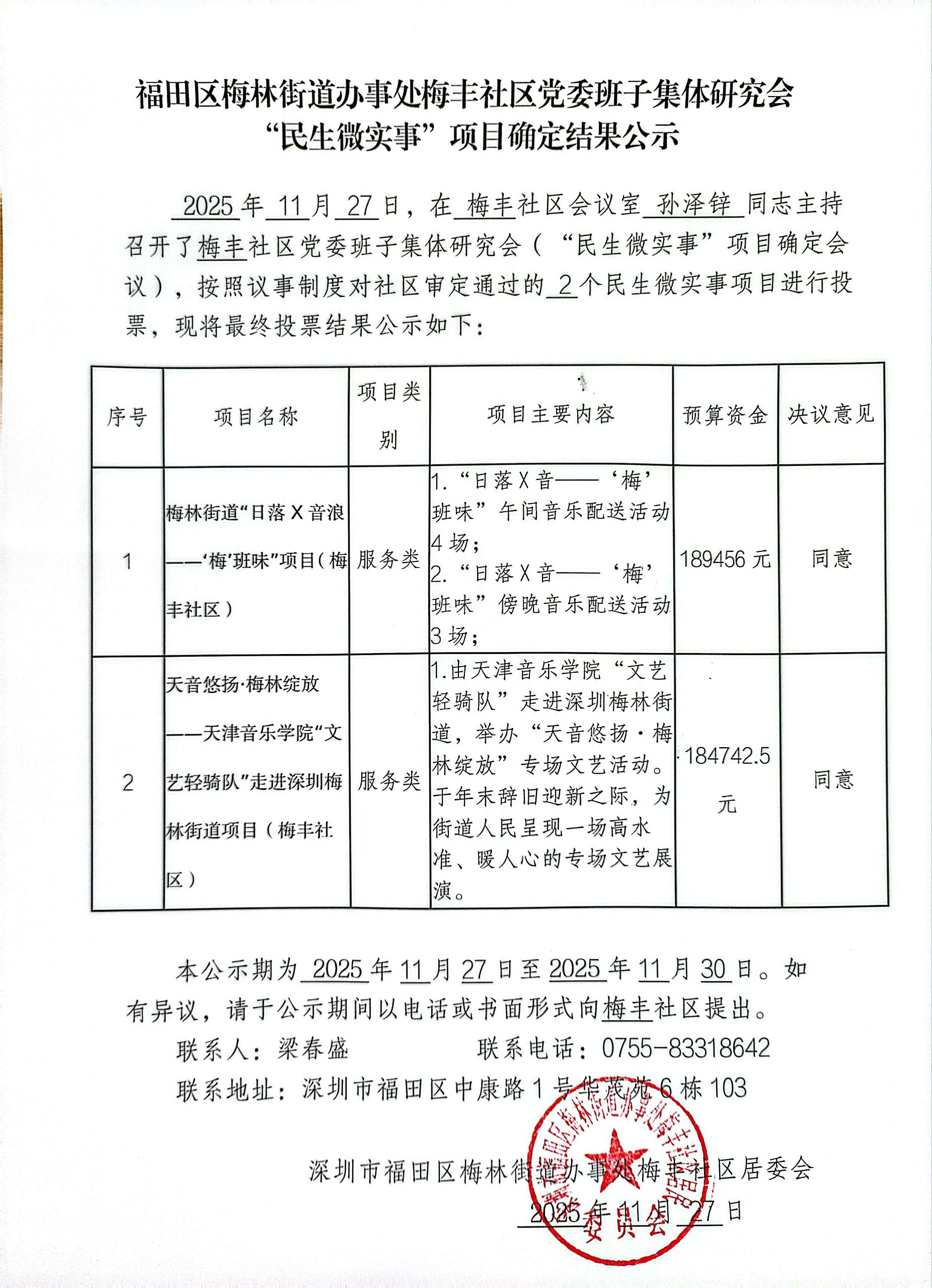 项目公示|福田区梅林街道梅丰社区党委班子集体研究会“民生微实事”项目确定结果公示