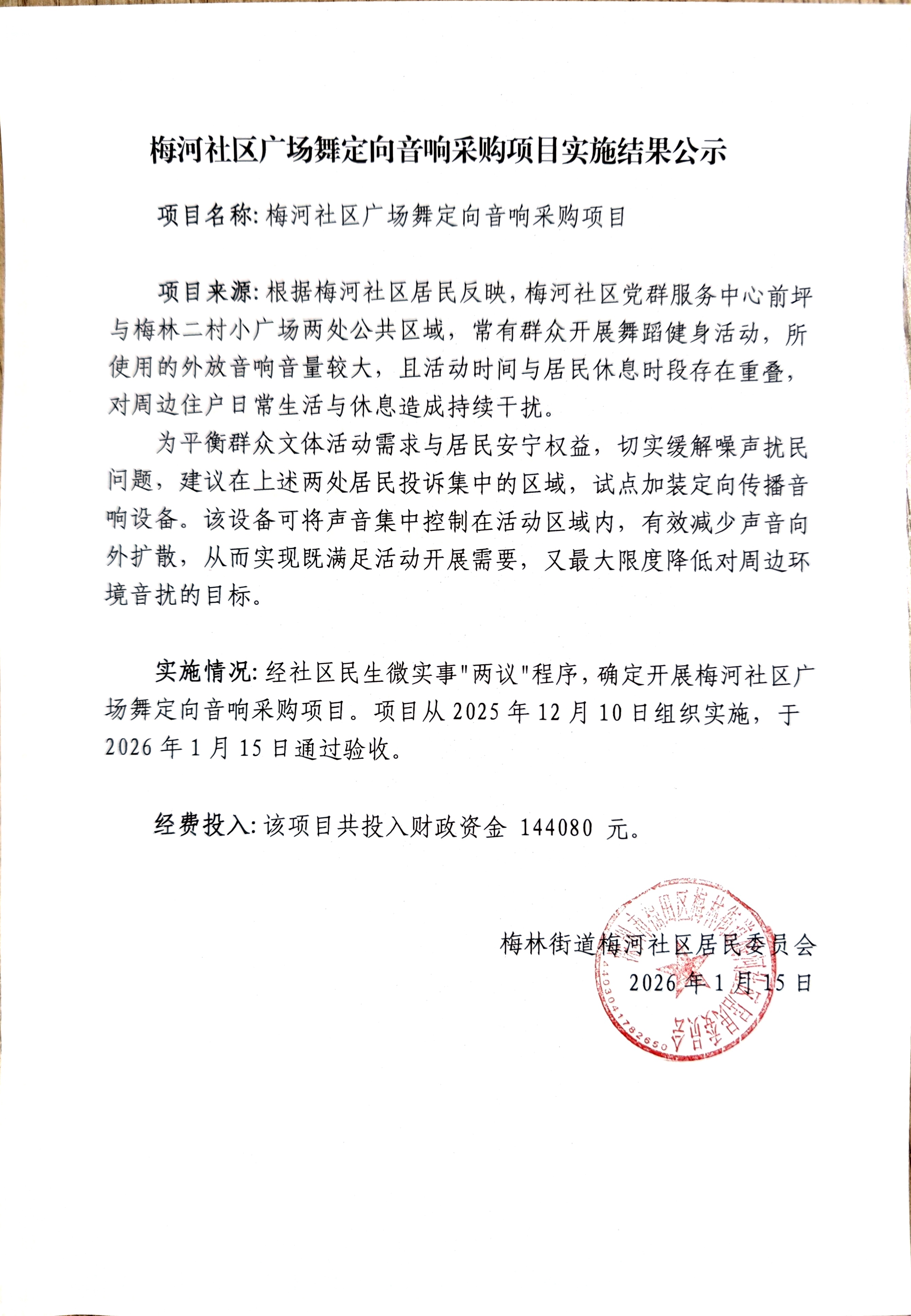 项目公示|福田区梅林街道梅河社区广场舞定向音响采购项目“民生微实事”项目实施结果公示