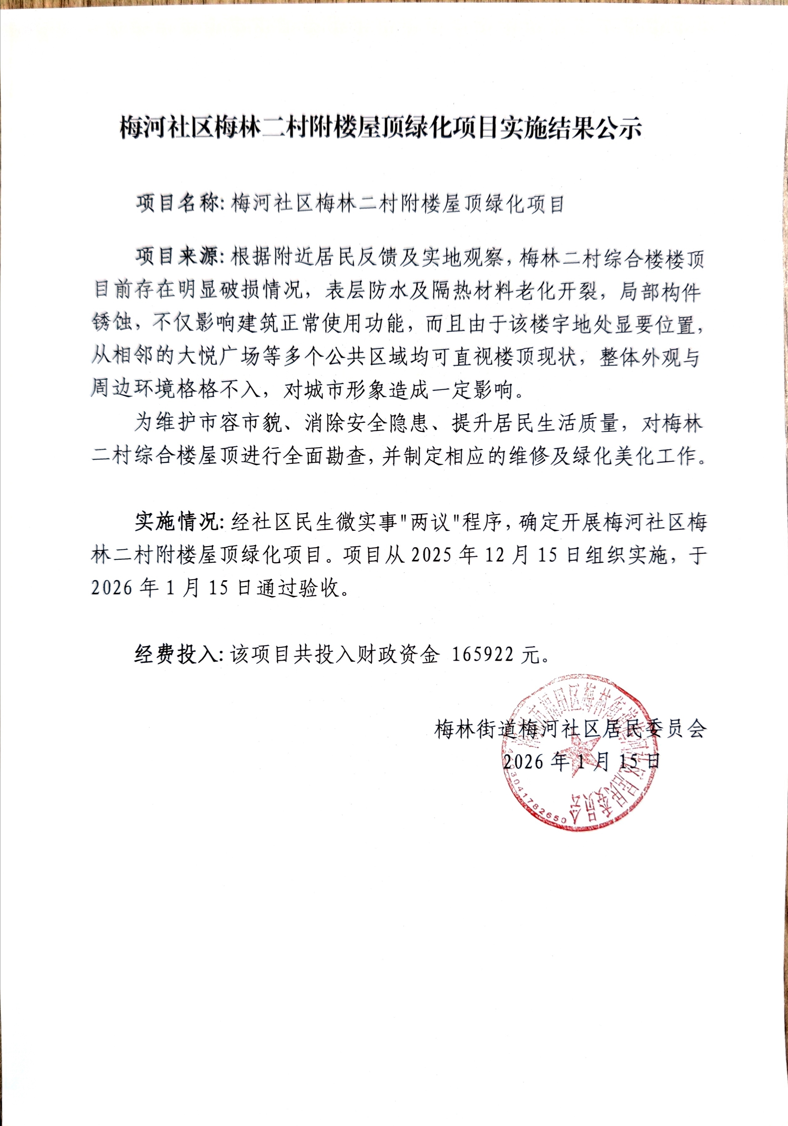 项目公示|福田区梅林街道梅河社区梅林二村附楼屋顶绿化项目实施“民生微实事”项目实施结果公示