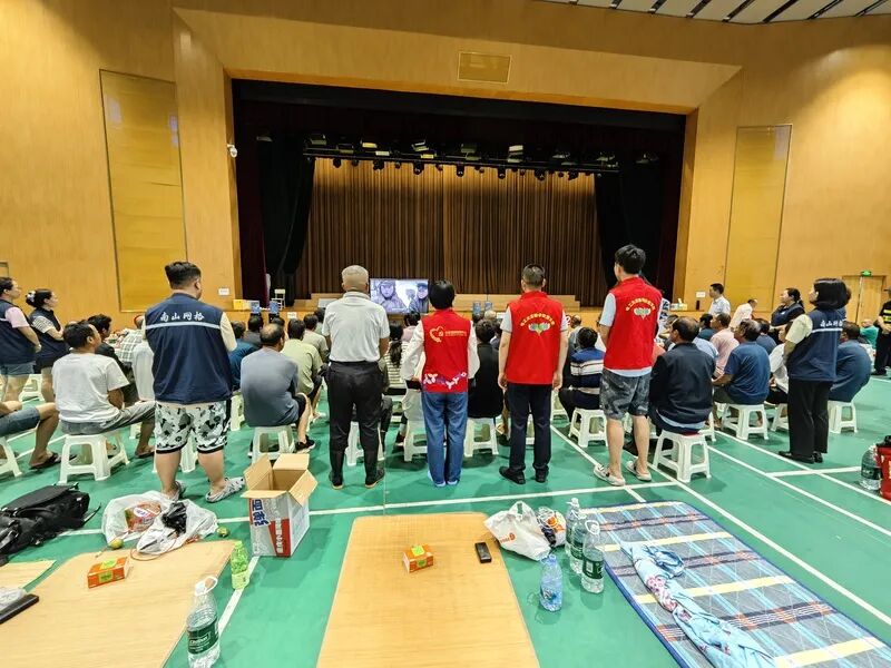 9月23日夜间,南山区桃源街道桃源社区哈尔滨工业大学(深圳)实验学校应急避难场所内,200余名安置工友或专注观看银幕上飘扬的五星红旗,或沉浸在书海中的精彩世界,共同度过超强台风之夜。