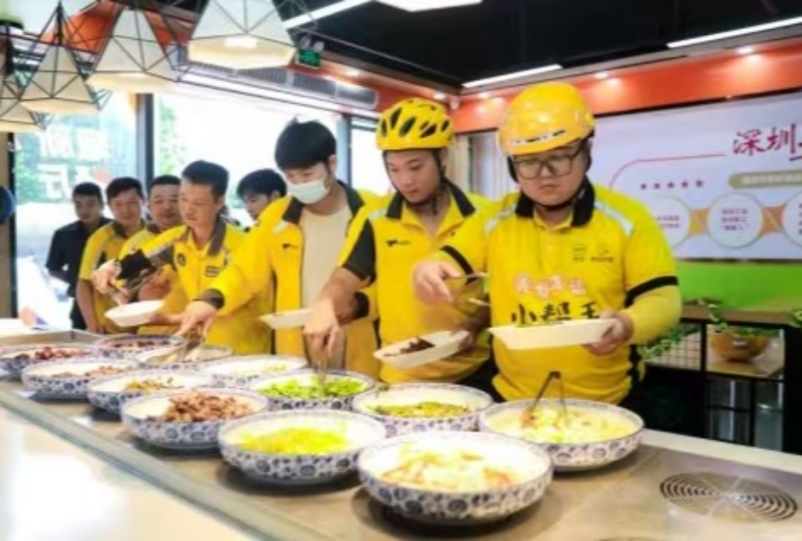 ·在坪地街道的香满园“暖新餐厅”,骑手们可以享用10元一份的两荤一素优惠套餐;