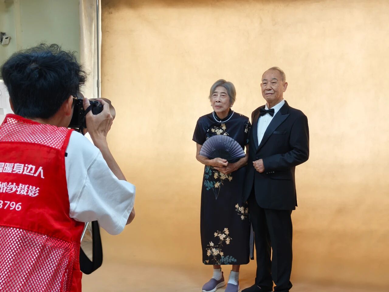 罗湖区黄贝岭街道怡景社区联合婚纱摄影机构举办“重阳敬老,婚纱传情”活动,15对老年夫妻参与,许多叔叔阿姨感慨道“年轻时没有条件拍婚纱照,如今终于弥补了遗憾,感谢社区对老年群体的关怀”。