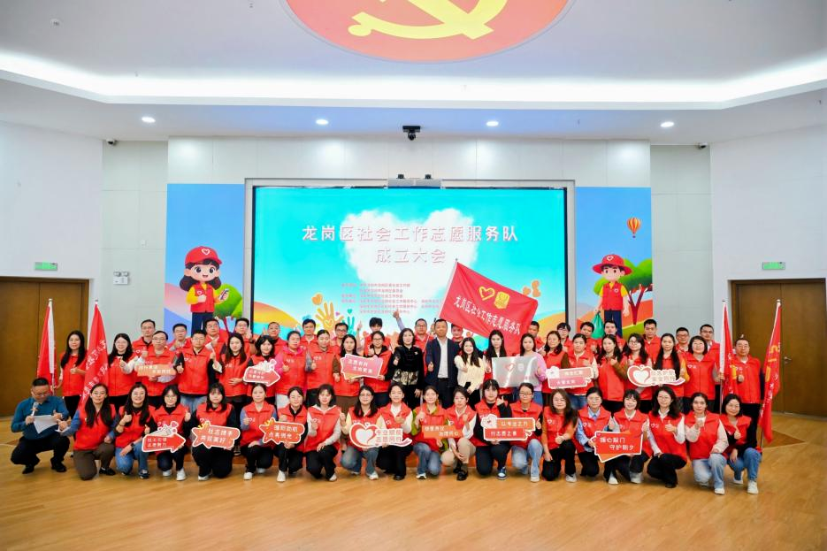 11月14日,龙岗区社会工作志愿服务队成立大会召开,现场举行授旗授牌仪式,正式成立龙岗区社会工作志愿服务总队,同步组建基层治理、应急处置、心理健康、关爱帮扶四支专业分队。总队及分队队长由龙岗区社工协会等五家单位的高级社会工作师担任,体现“专业引领、服务为本”理念。