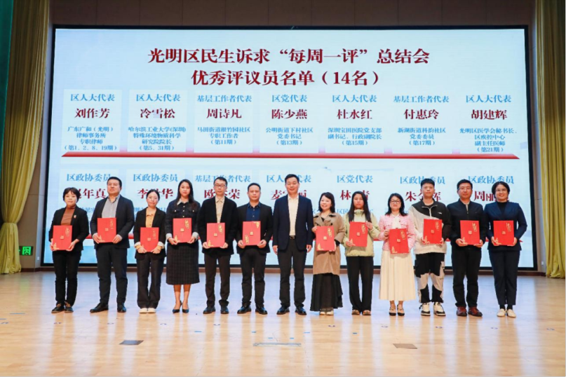 12月17日,“光明社会工作学堂”第54期活动暨光明区民生诉求“每周一评”总结会顺利召开。区委副书记、政法委书记张华伟出席。会议共设置“总结表扬、现场评议、专题培训”三个环节,系统总结“每周一评”机制建立以来取得的扎实进展,并对年度优秀评议员、优秀特约观察员和优秀汇报人共计34人进行表彰。现场开展第37期“每周一评”集中评议,对“汽车充电桩配置”与“小区垃圾分类点选址”两起典型工单开展常规评议与“回头看”评议。评议结束后围绕诉求办理规则与技巧开展专题培训,实现从“实践评议”到“能力淬炼”的无缝衔接。截至目前,光明区累计开展37期线上线下“每周一评”,推动117个重难点工单实质化解,全区民意速办综合满意率稳居99.99%,按期办结率100%,形式办结工单量同比下降96.67%。