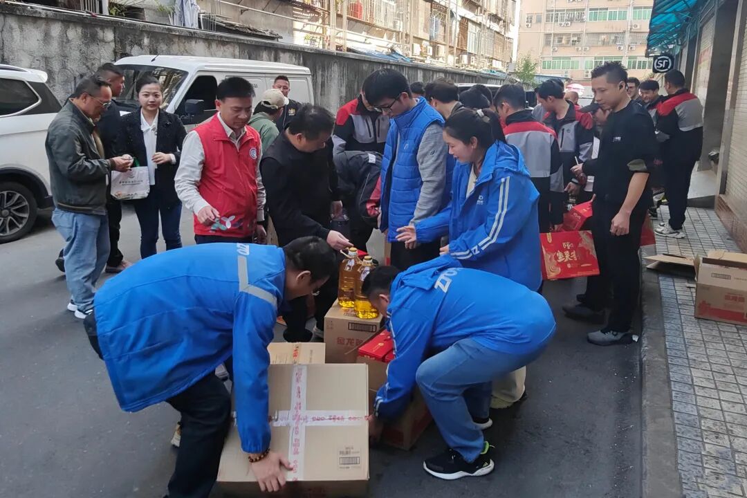 百余份精心筹备的慰问物资整齐列队,每份包含一桶食用油、一袋优质米、一盒坚果礼盒,全是贴合新就业群体日常需求的“实在好物”。