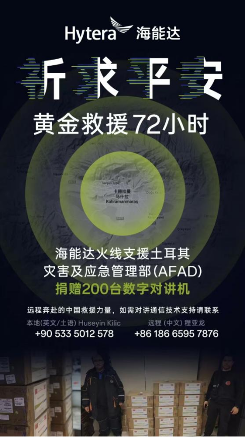 2023年2月6日凌晨4时,土耳其南部发生7.8级强震。巨大的地震以及其后累计发生的6040次余震,致该国超五万人遇难。位于当地的海能达土耳其团队收到消息后,立即联系深圳总部启动应急机制。总部迅速评估当地通信设备的库存情况,并决定向土耳其灾害及应急管理部(AFAD)捐赠200台数字对讲机。这些设备通话质量高、便携、耐用且能够超长时间续航,帮助灾害现场人员进行搜救和医疗救援。与此同时,海能达迅速制作了多语言版本的援助海报,通过中国和海外的各类社交媒体发布,公司向多个国家的救援团队免费提供应急通信设备及技术支持服务。公司土耳其本地员工和中方员工24小时待命,让救援队在分秒必争的救援工作中,随时能够保持队伍间的联系,更好的开展救援工作,挽救更多的生命。