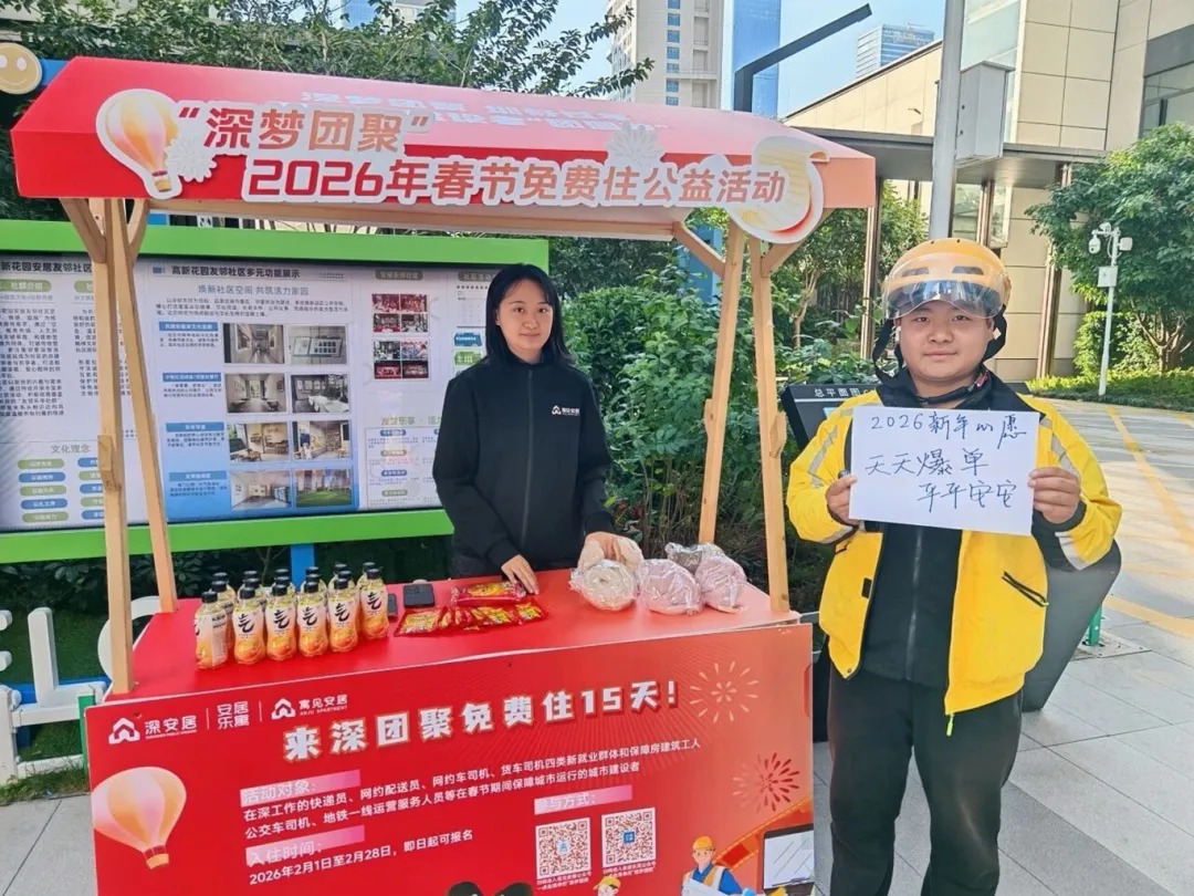 今年春节,深圳市委社会工作部联合多部门还推出了“深梦团聚”免费住房活动,为快递员、网约车司机等新就业群体提供500套住房免费入住15天,让奔波在外的劳动者能把家人接来团圆。