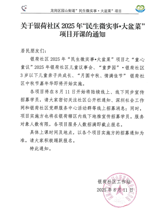 项目预告|龙岗区园山街道银荷社区关于2025年“民生微实事·大盆菜”项目“童心童议”开课的通知