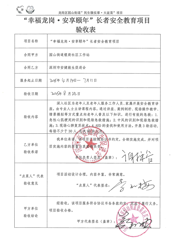项目公示|龙岗区园山街道银荷社区2025年“幸福龙岗·安享颐年”长者安全教育项目“民生微实事”项目验收结果公示