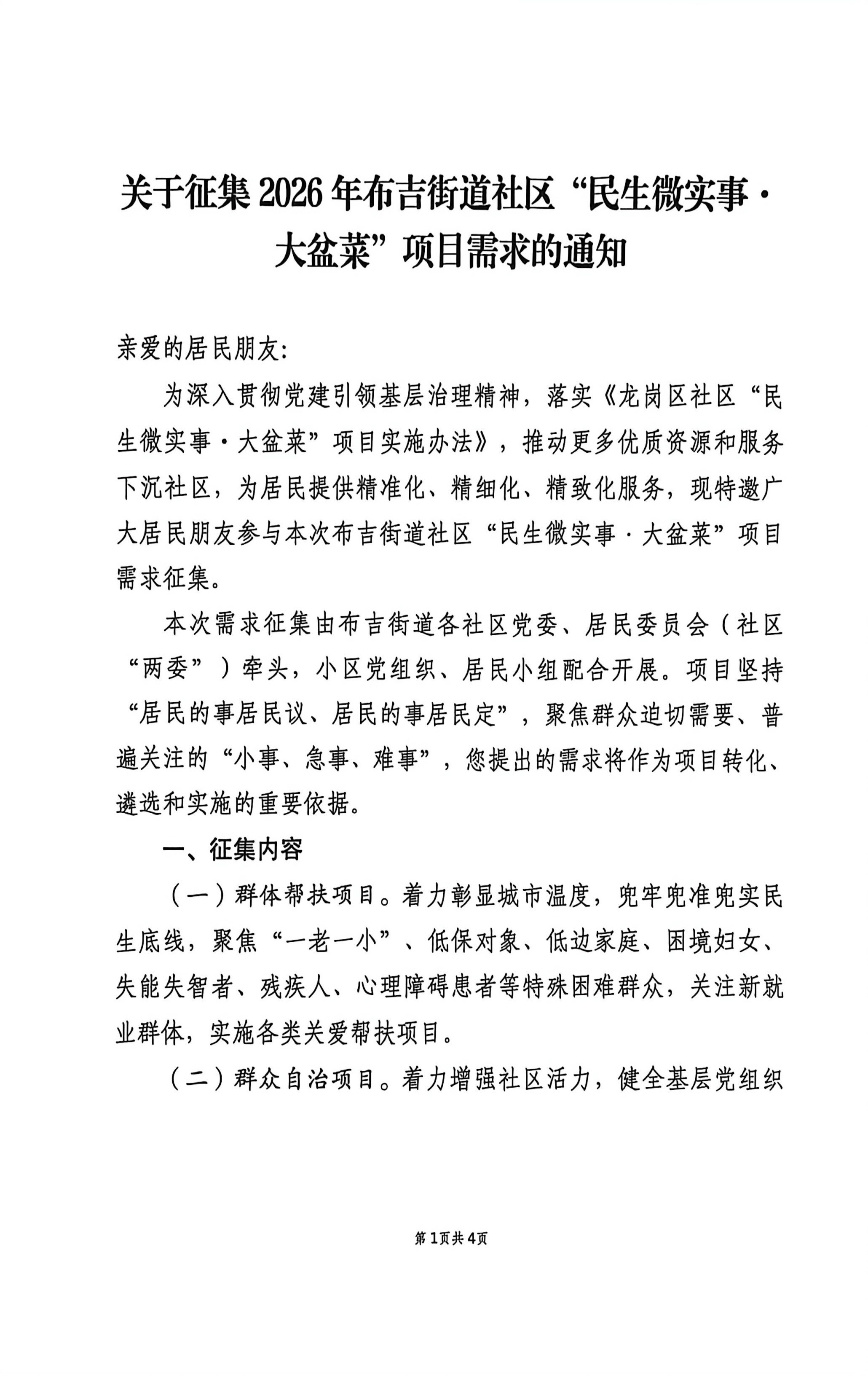 项目公示|龙岗区布吉街道布吉社区2026年“民生微实事·大盆菜”项目需求征集的公示