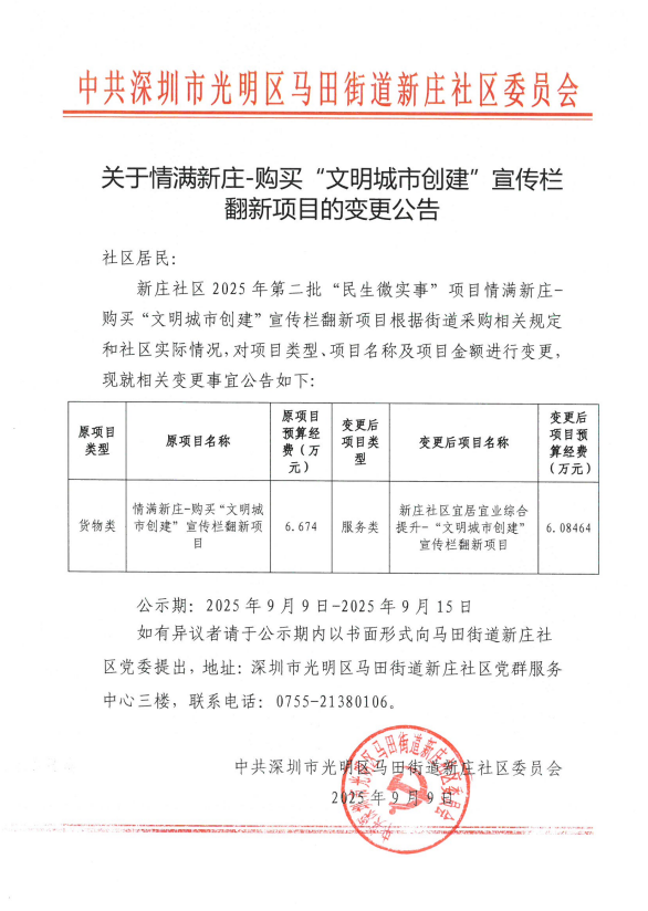 项目公示|光明区马田街道新庄社区关于情满新庄-购买“文明城市创建”宣传栏翻新项目的变更公告
