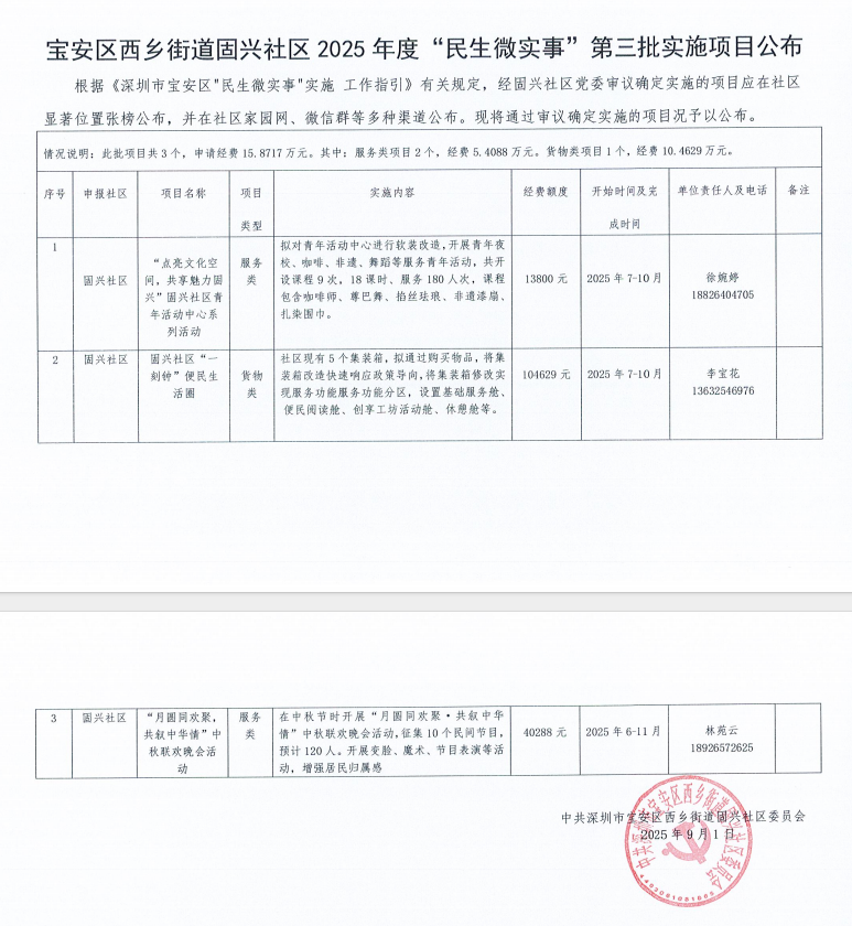 项目公示|宝安区西乡街道固兴社区2025年度“民生微实事”第三批实施项目公布