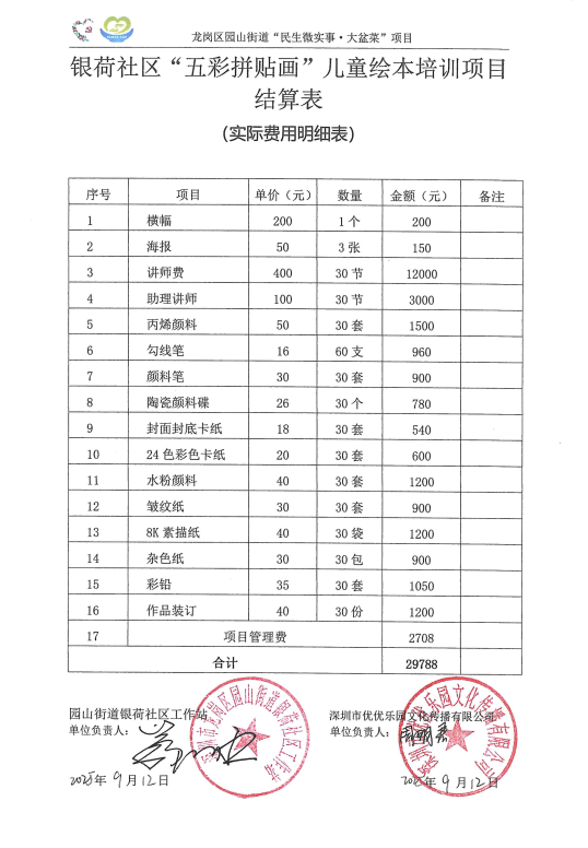 项目公示|龙岗区园山街道银荷社区2025年“五彩拼贴画”儿童绘本培训“民生微实事”项目结算表公示