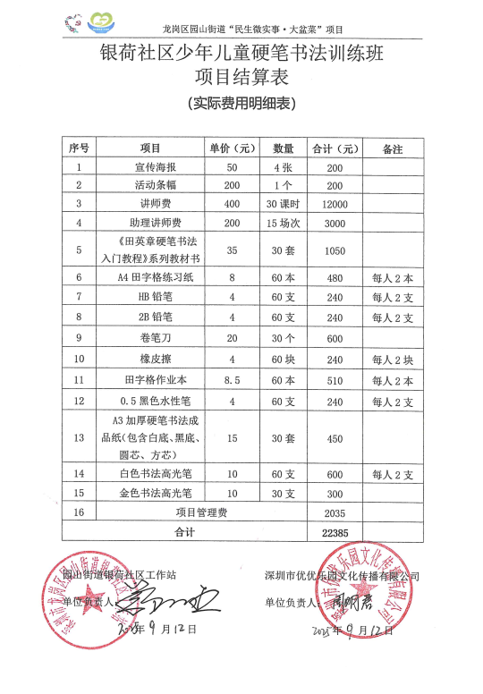 项目公示|龙岗区园山街道银荷社区2025年少年儿童硬笔书法训练班“民生微实事”项目结算表公示