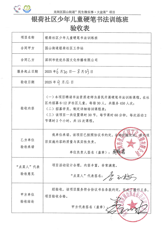 项目公示|龙岗区园山街道银荷社区2025年少年儿童硬笔书法训练班“民生微实事”项目验收公示