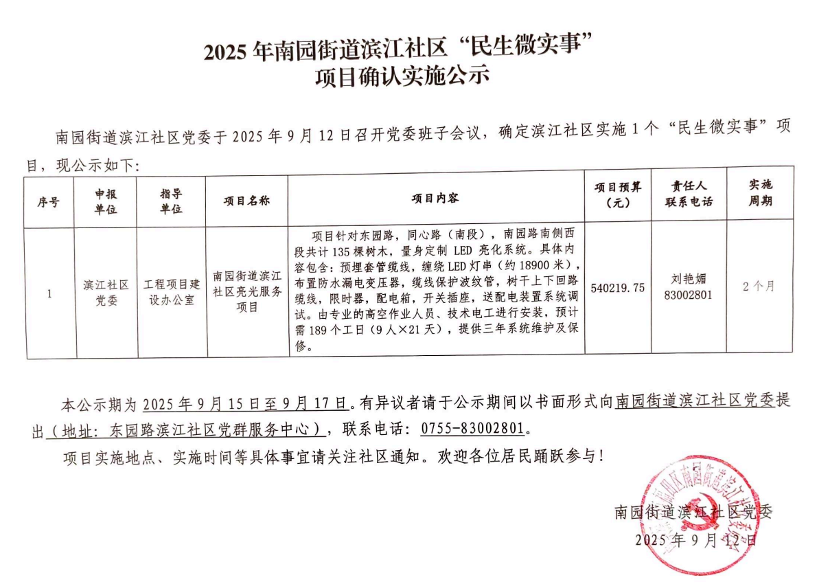 项目公示|福田区南园街道滨江社区2025年“民生微实事”项目确认实施公示