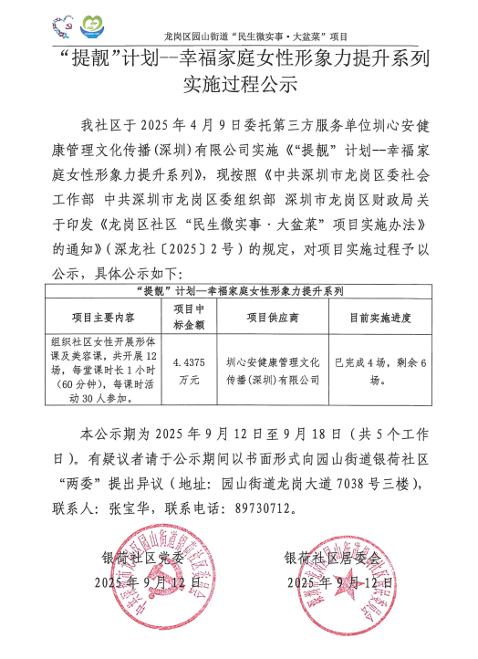 项目公示|龙岗区园山街道银荷社区2025年“提靓”计划——幸福家庭女性形象力提升系列“民生微实事”项目实施过程公示