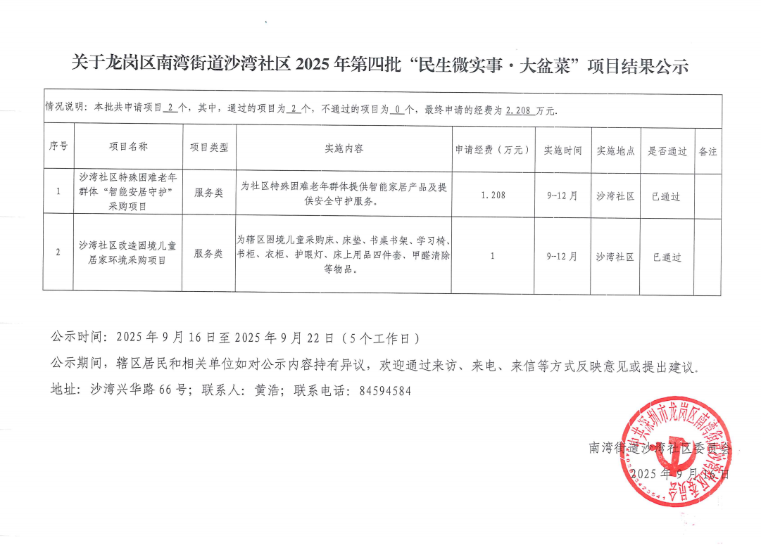 项目公示|龙岗区南湾街道沙湾社区2025年第四批“民生微实事”项目结果公示