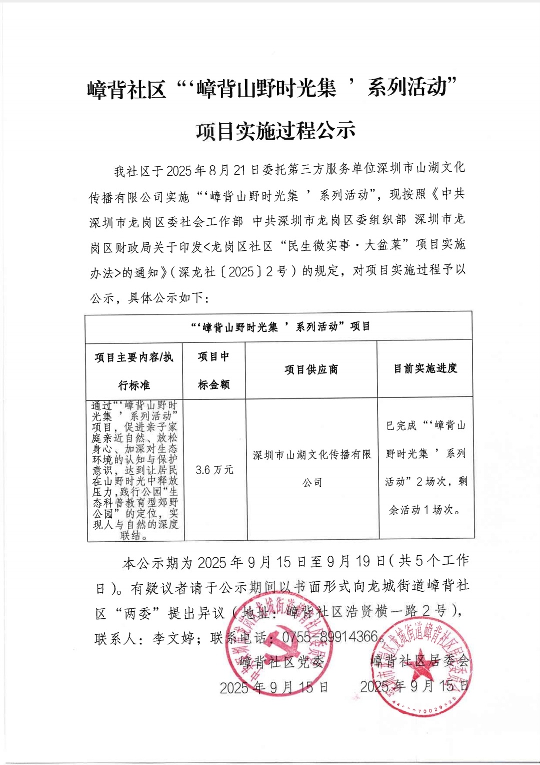 项目公示|龙岗区龙城街道嶂背社区2025年“‘嶂背山野时光集’系列活动”“民生微实事”项目实施过程公示