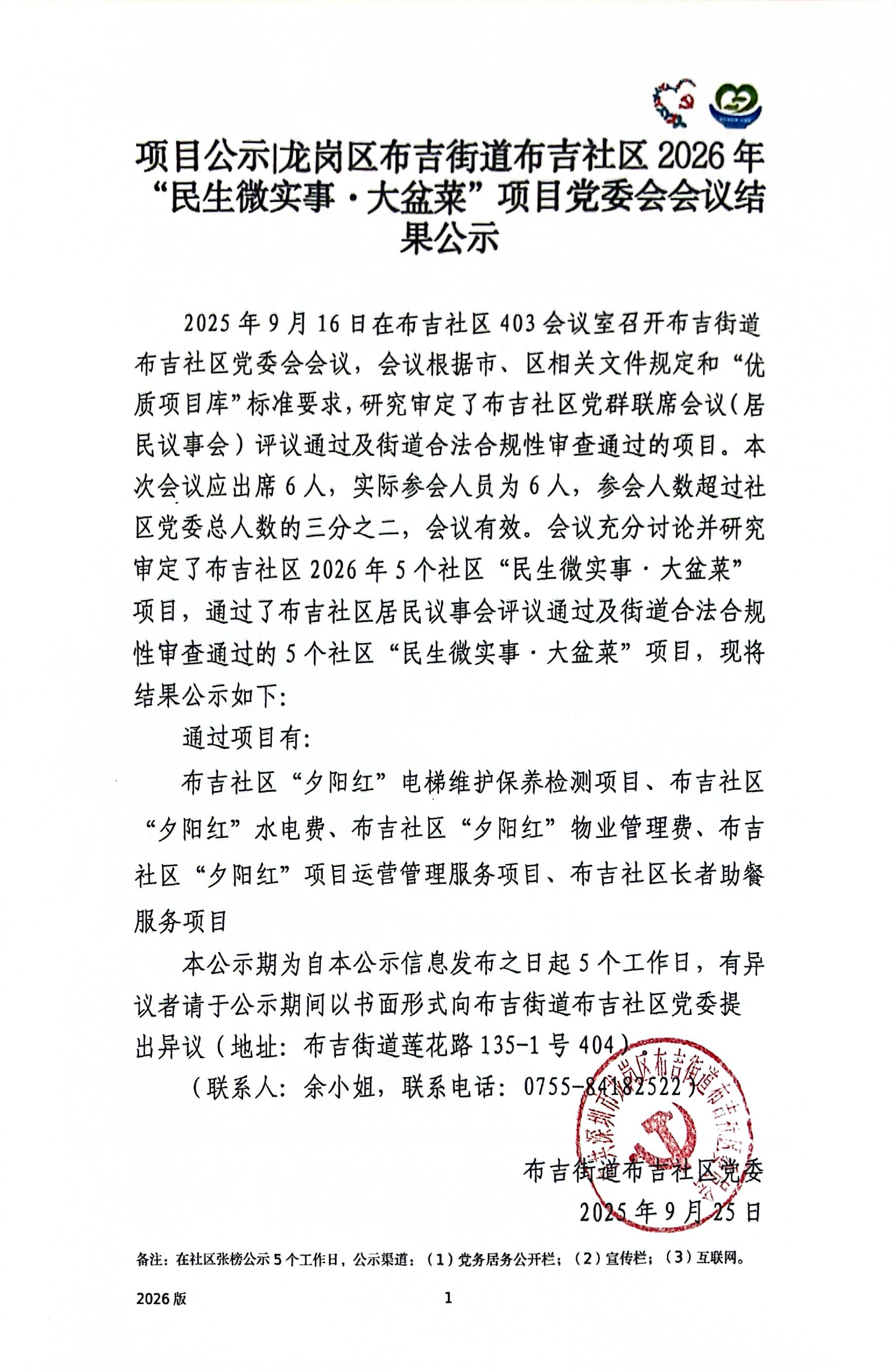 项目公示|龙岗区布吉街道布吉社区2026年“民生微实事·大盆菜”项目社区党委会会议结果公示