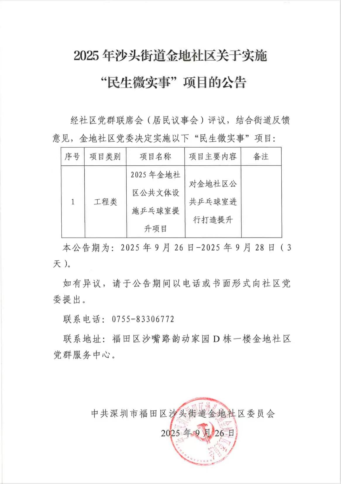项目公示|福田区沙头街道金地社区2025年关于实施“民生微实事”项目的公告