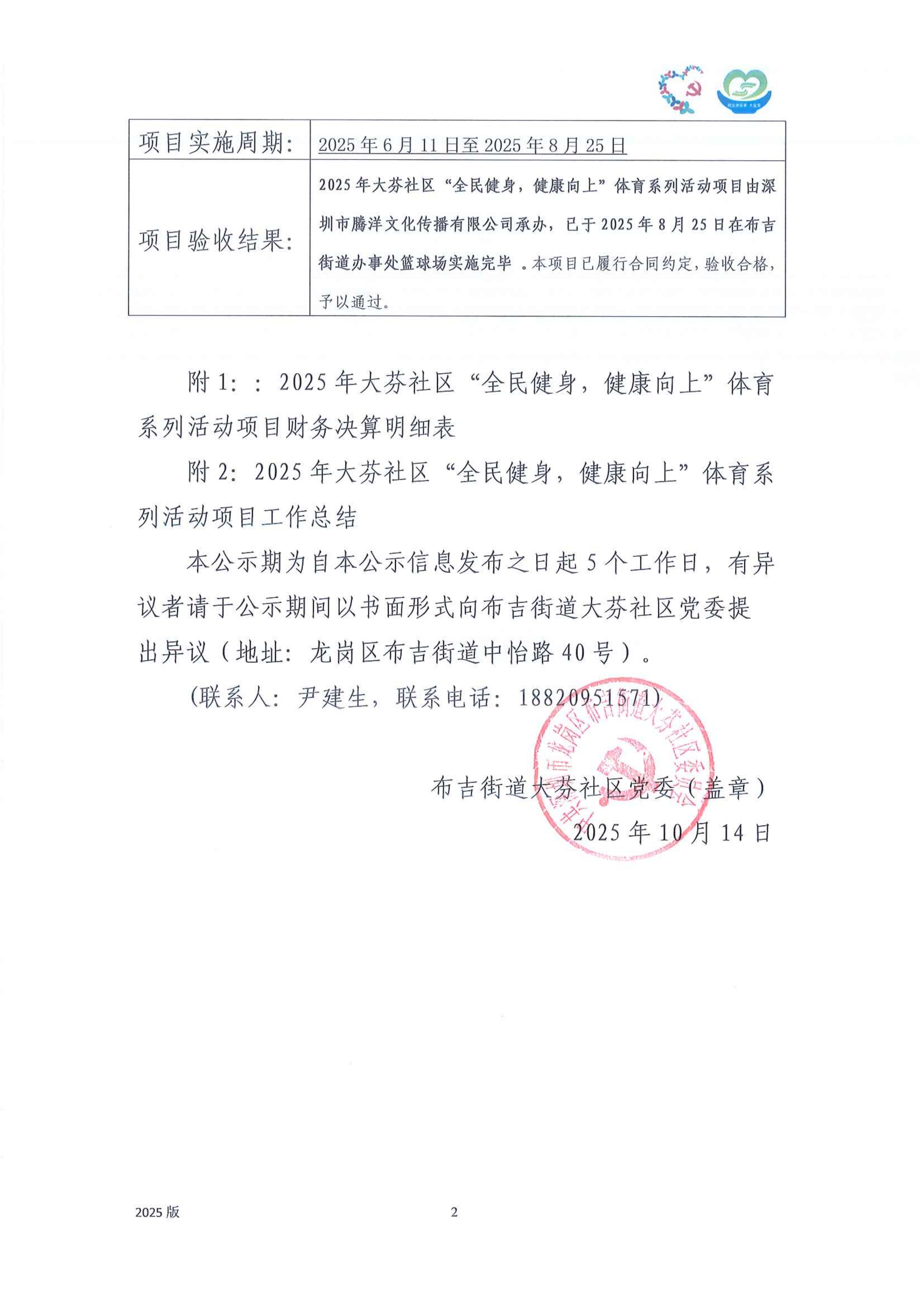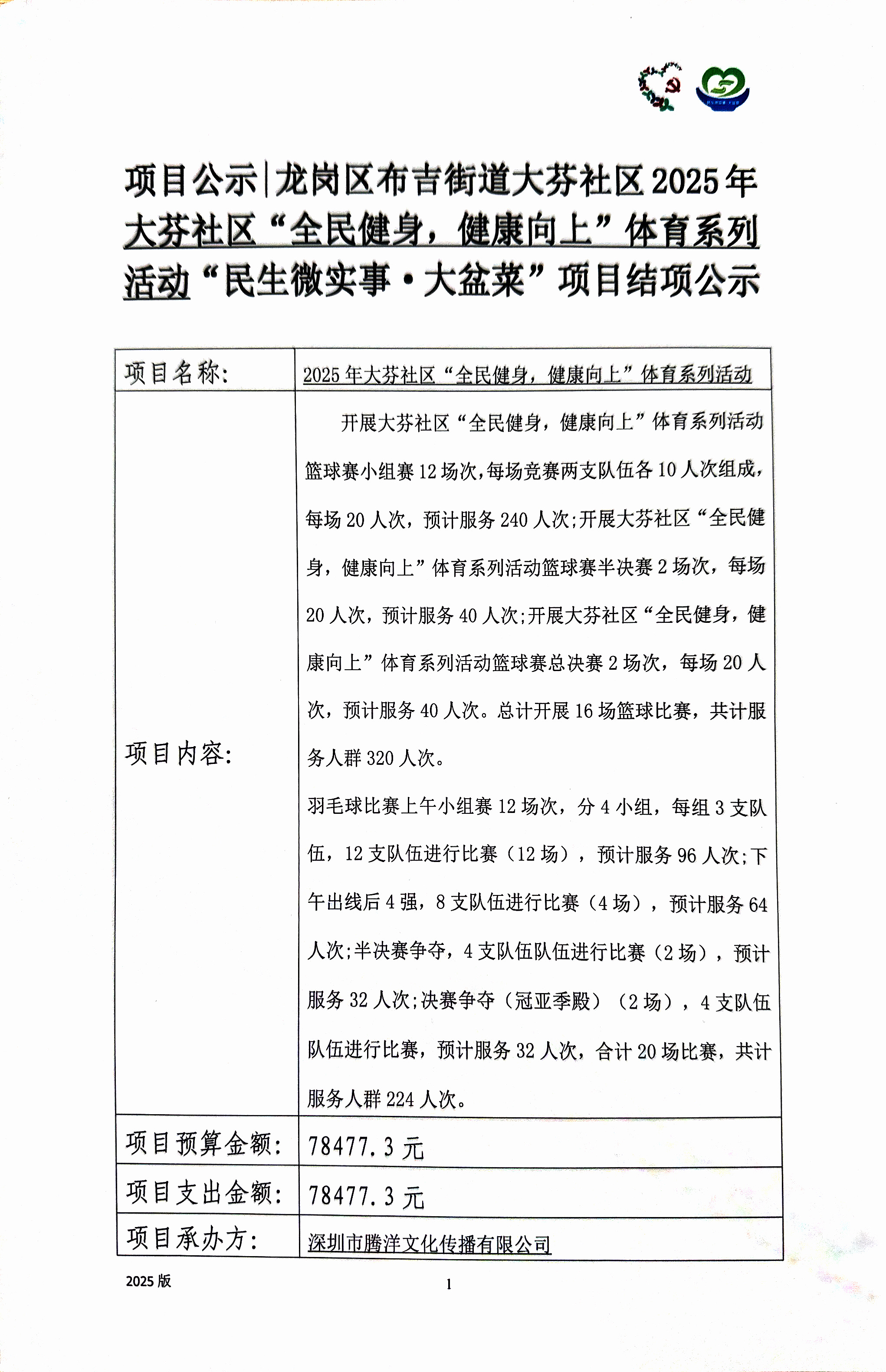 项目公示|龙岗区布吉街道大芬社区2025年大芬社区“全民健身,健康向上”体育系列活动“民生微实事·大盆菜”项目结项公示