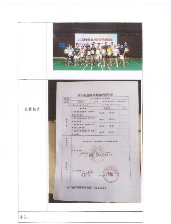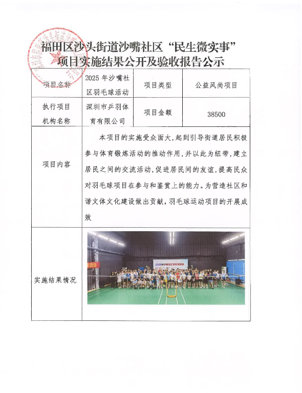 项目公示|福田区沙头街道沙嘴社区2025年沙嘴社区羽毛球活动“民生微实事”项目实施结果公开及验收报告公示