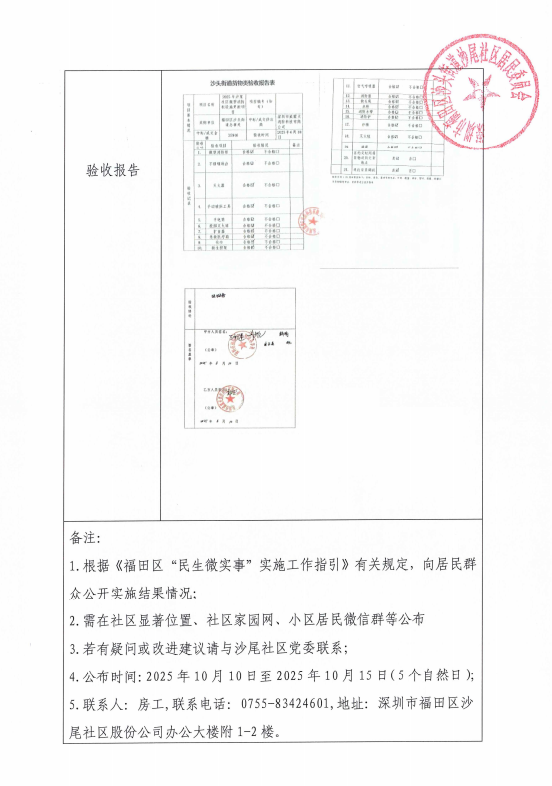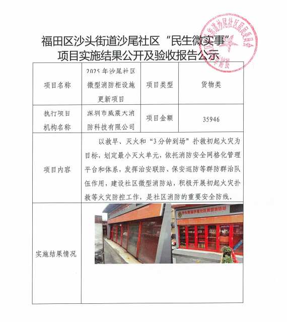 项目公示|福田区沙头街道沙尾社区2025年微型消防柜设施更新项目“民生微实事”项目实施结果公开及验收报告公示