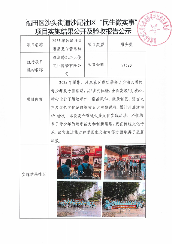 项目公示|福田区沙头街道沙尾社区2025年沙尾社区暑期夏令营活动“民生微实事”项目实施结果公开及验收报告公示