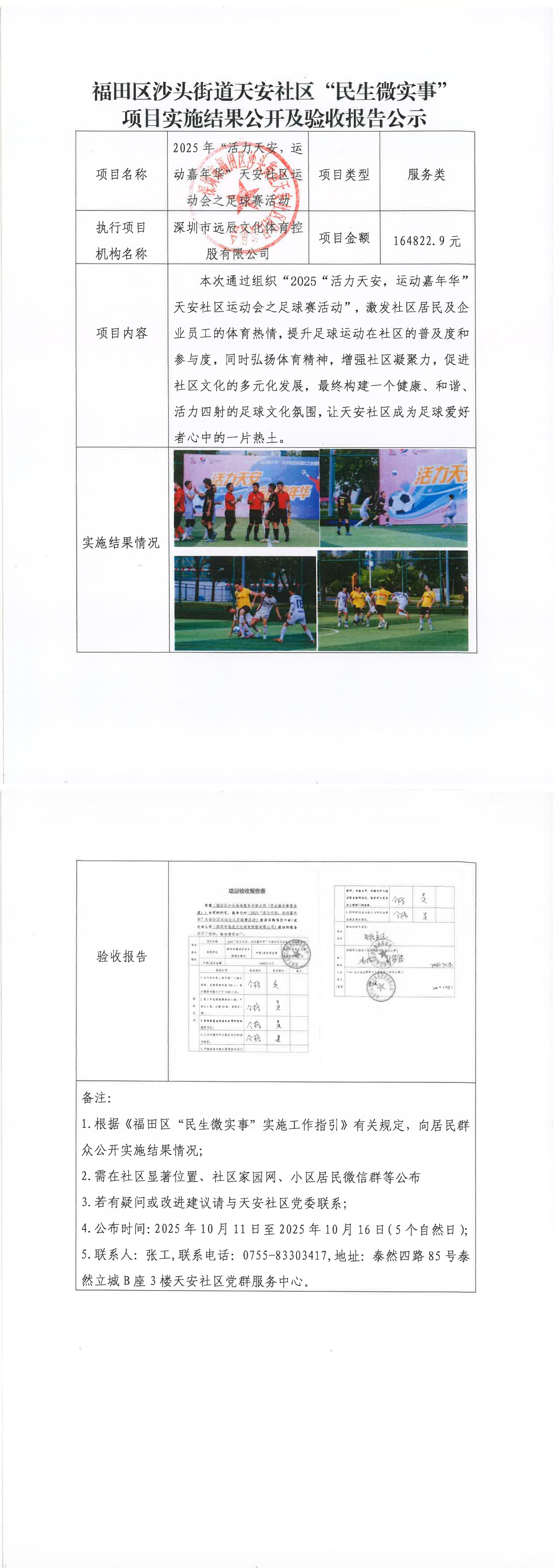 项目公示|福田区沙头街道天安社区2025年“活力天安,运动嘉年华”天安社区运动会之足球赛活动“民生微实事”项目实施结果公开及验收报告公示