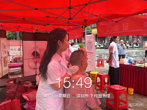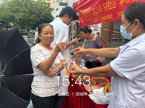 为弘扬中华优秀传统文化,提升居民中医药健康素养,2025年10月12日下午,“承岐黄薪火,传中医经典”中医文化传承系列活动在下村社区图书馆门口成功举办。本次活动吸引了约百名社区居民踊跃参与,现场气氛热烈,大家在亲身体验中感受了中医药的独特魅力。