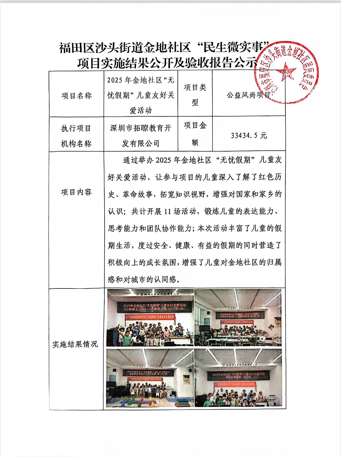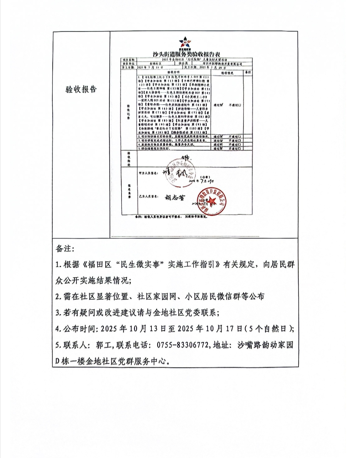 项目公示|福田区沙头街道金地社区2025年“无忧假期”儿童友好关爱活动“民生微实事”项目实施结果公开及验收报告公示