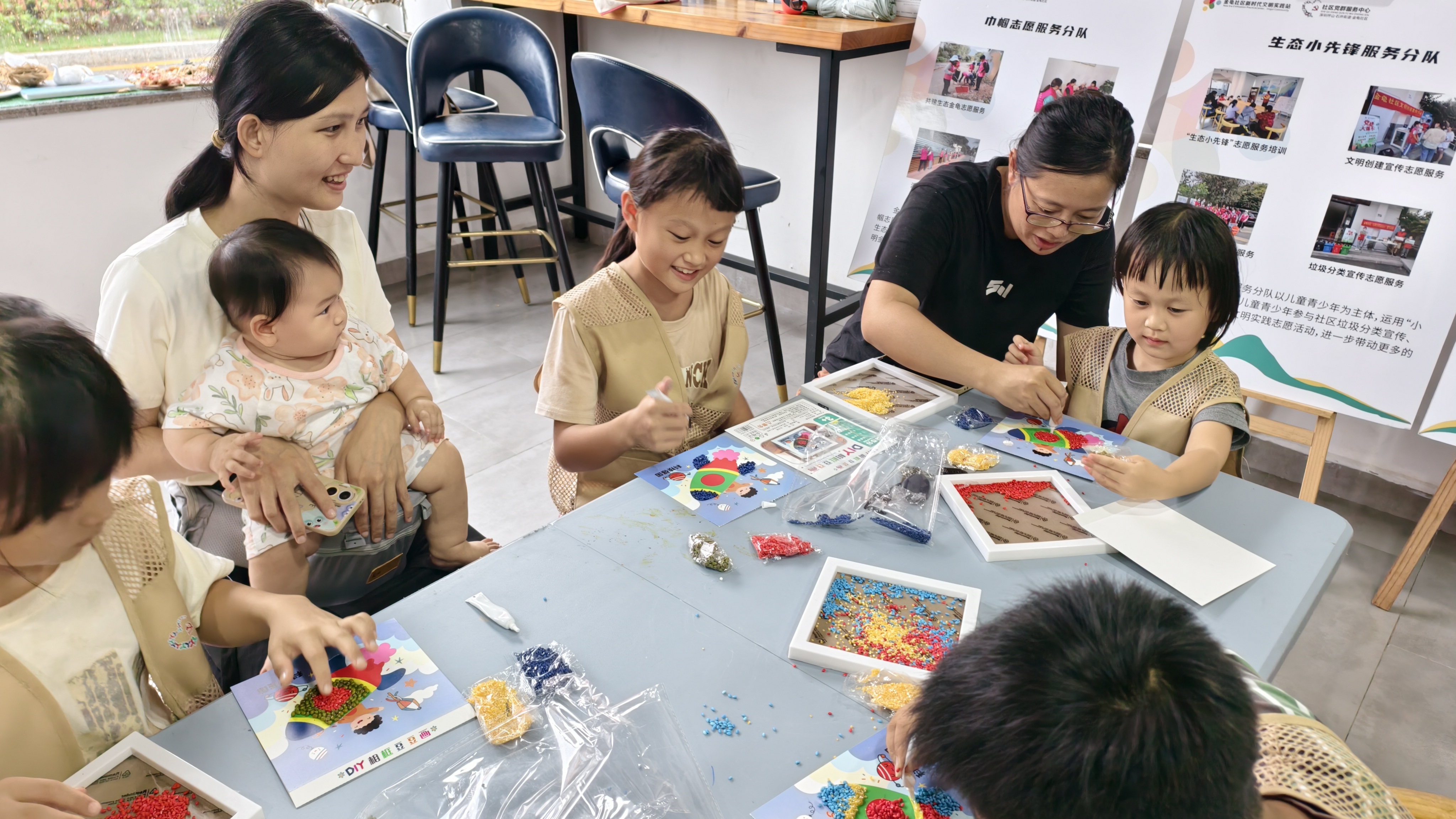 故事会后,老师引导亲子家庭开展种子粘贴画手工制作。孩子们用不同形状与颜色的种子进行创作,向父母讲述画面中的故事,将自然之美与阅读之趣凝结为一件件充满童趣的艺术作品,进一步激发了孩子们的想象力与创造力。一位参与活动的家长表示:“平时很少有机会静下心来陪孩子一起阅读和动手创作。今天在这么有氛围的书吧里,孩子听得认真、做得投入,我们大人也仿佛找回了儿时那份纯粹的快乐。”