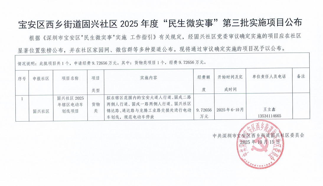 项目公示|宝安区西乡街道固兴社区2025年度“民生微实事”第三批实施项目公布