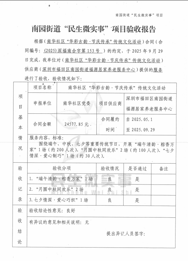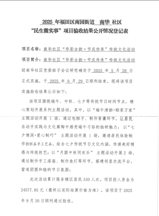 项目公示|福田区南园街道南华社区“华彩古韵·节庆传承”传统文化活动“民生微实事”项目验收结果公示